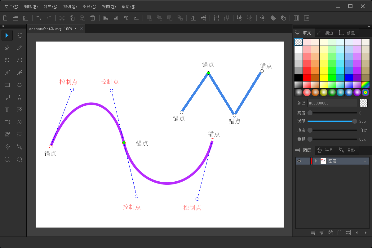 所有的矢量图形从根本上来说,都是由点和线构成的数学几何图形。具体来说,线条又分为直线和曲线,曲线一般是指贝塞尔曲线,包括二次贝塞尔曲线和三次贝塞尔曲线。百绘大师默认用的是三次贝塞尔曲线,在锚点的两端各有一个控制点。